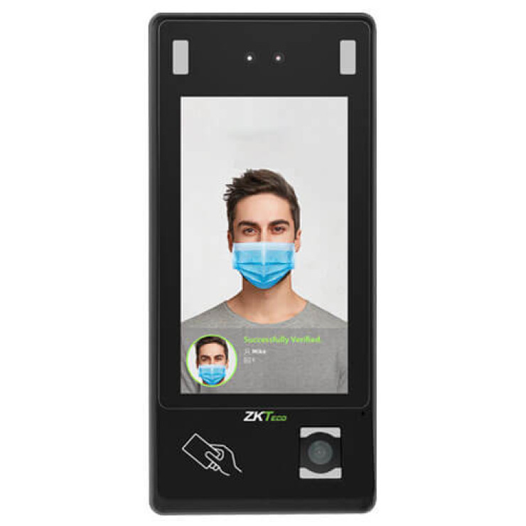 Multi-biometric identification terminal that features ZKTeco’s innovative Enhanced Visible Light Facial Recognition and QR Code Scanning technology. The device with the latest technologies can automatically perform recognition at a distance from 0.5m to 3m when a face is detected. Features: scans QR code on the ZKBioSecurity Mobile App; ELATEC card modules can support 125kHz, 134.2kHz and 13.56MHz RFID cards; 7-inch touch screen; capacity 10,000 users, 10,000 faces, 10,000 fingerprints, 10,000 cards, 1,000,000 transactions; mask detection; communication TCP/IP, USB host, Bluetooth, Wi-Fi, Wiegand input/output; access control interface – lock relay output, exit button, alarm output, door sensor, external bell.